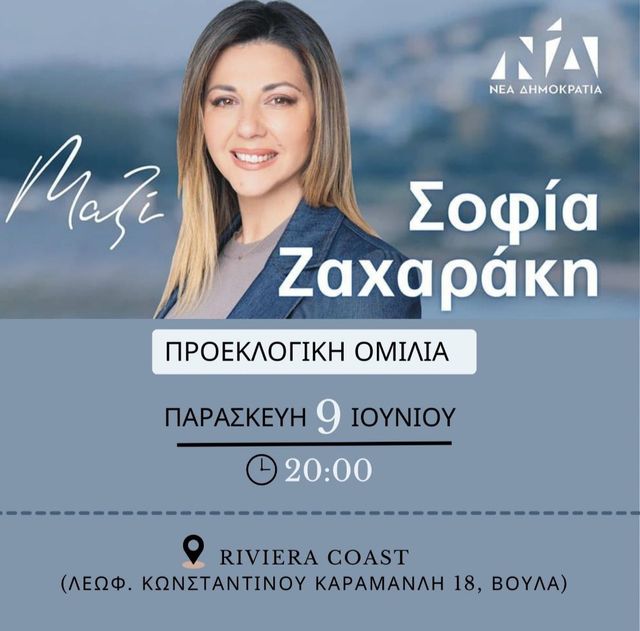 Η υποψήφια Βουλευτής με την ΝΔ στην Ανατολική Αττική, καλεί σε προεκλογική συγκέντρωση αύριο Παρασκευή 9 Ιουνίου στις 8 μ.μ. στο Riviera Coast (Κ. Καραμανλή 18, Βούλα, δίπλα απ΄οτο Δημαρχείο).