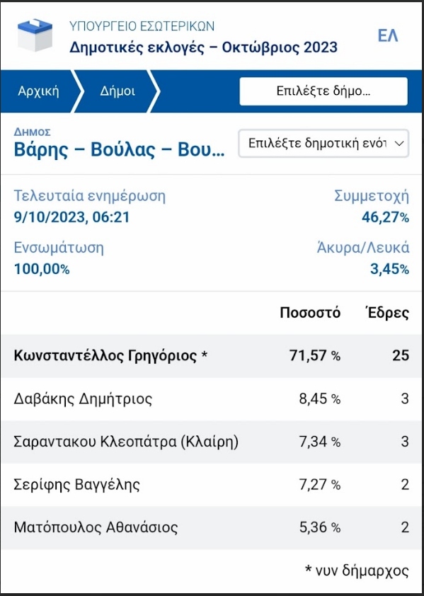 Σύμφωνα με αποκλειστικές πληροφορίες του athinaikiriviera, λόγω λάθους υπολογισμού συνέπεια προβλήματος με τον αλγόριθμο της εταιρείας που έχει τη διαδικασία των εδρών που κατανέμονται στους συνδυασμούς, ο συνδυασμός του Γρηγόρη Κωνσταντελλου "ΠΟΛΗ ΓΙΑ ΝΑ ΖΕΙΣ " κερδίζει άλλη μια έδρα και φτάνει στις 26 αντί για 25 όπως αρχικώς είχε ανακοινωθεί.